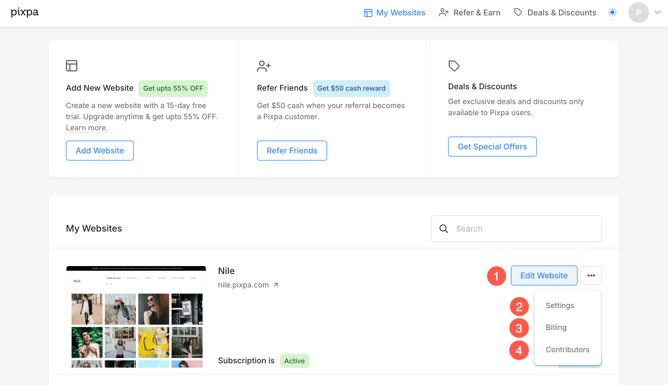 Mit Pixpa können Sie mehrere Websites unter demselben Konto erstellen und verwalten. Sie erhalten außerdem 25 % Rabatt auf Monatspläne, 40 % Rabatt auf Jahrespläne und hat 55% Rabatt auf halbjährlichen Plänen zusätzlicher Websites.