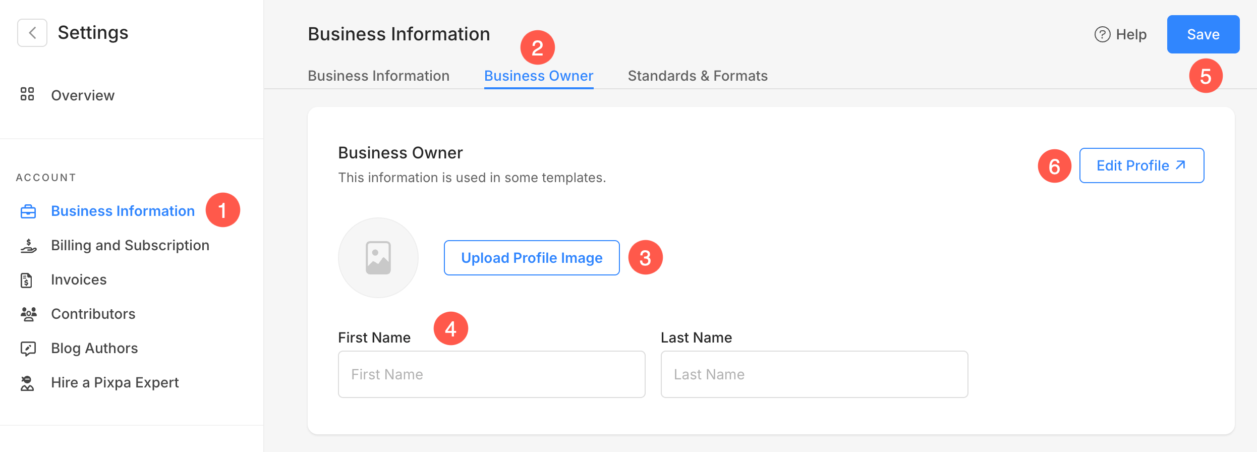 Pixpa アカウントの事業主情報は、 ビジネス情報 ページで見やすくするために変数を解析したりすることができます。