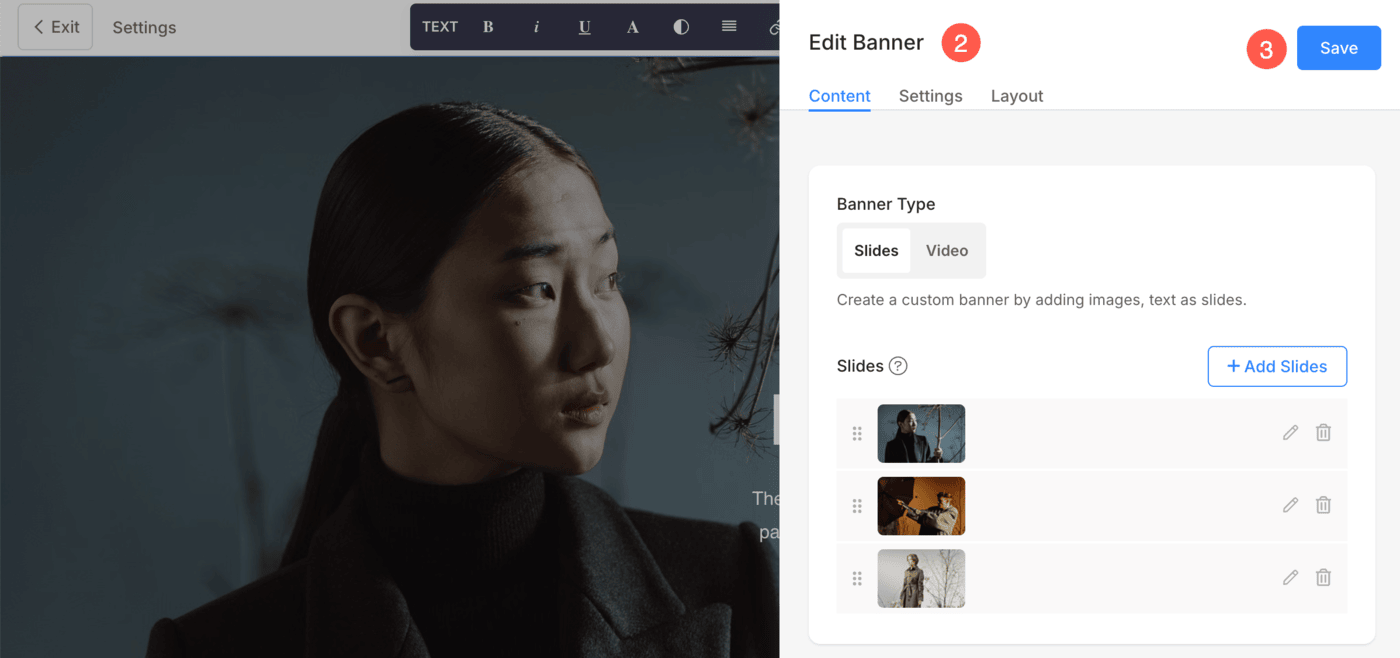 When Slides is selected under Banner Type, you can create a slideshow by uploading multiple images as banner slides.