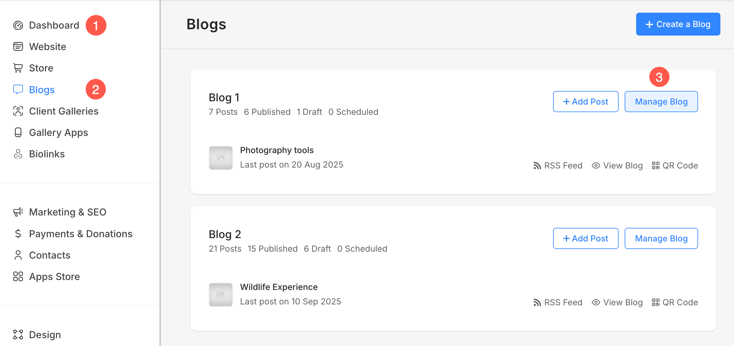 - From the Dashboard (1) of the studio, click on the Blogs (2) section.