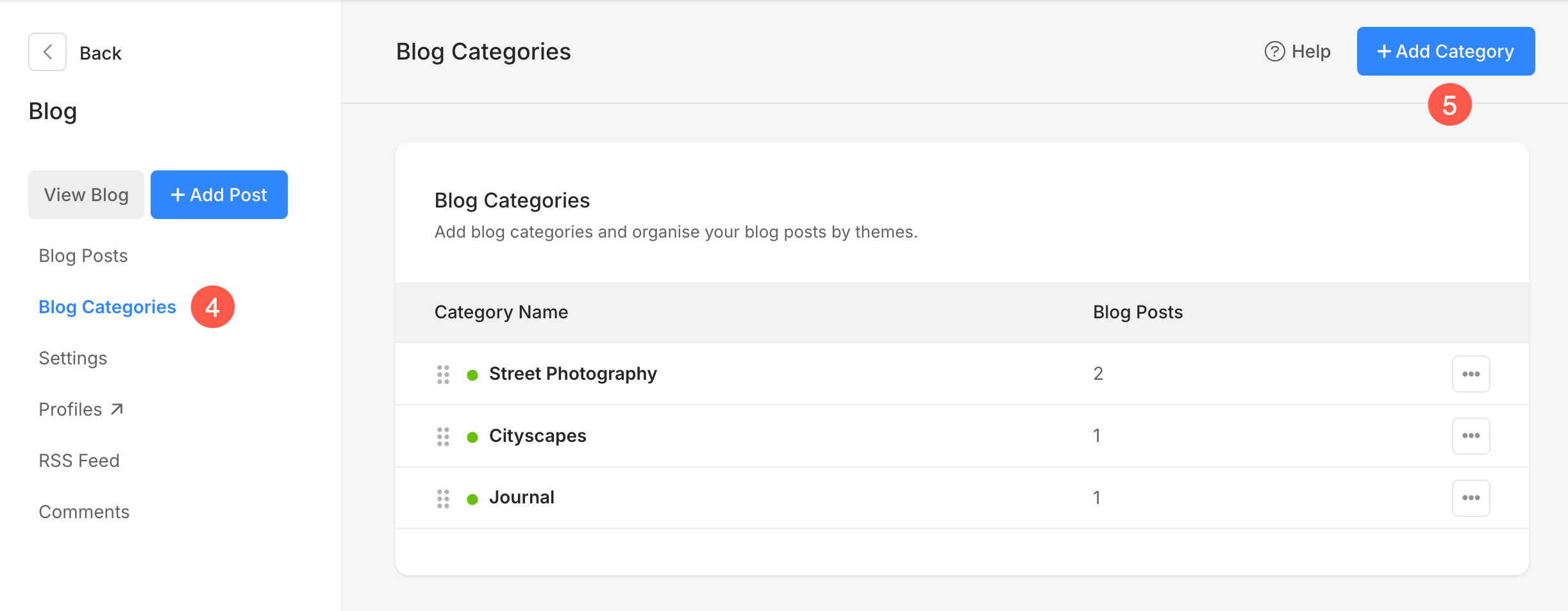- Now you will see a + Add Category (5) button from where you can add new categories for this particular blog.