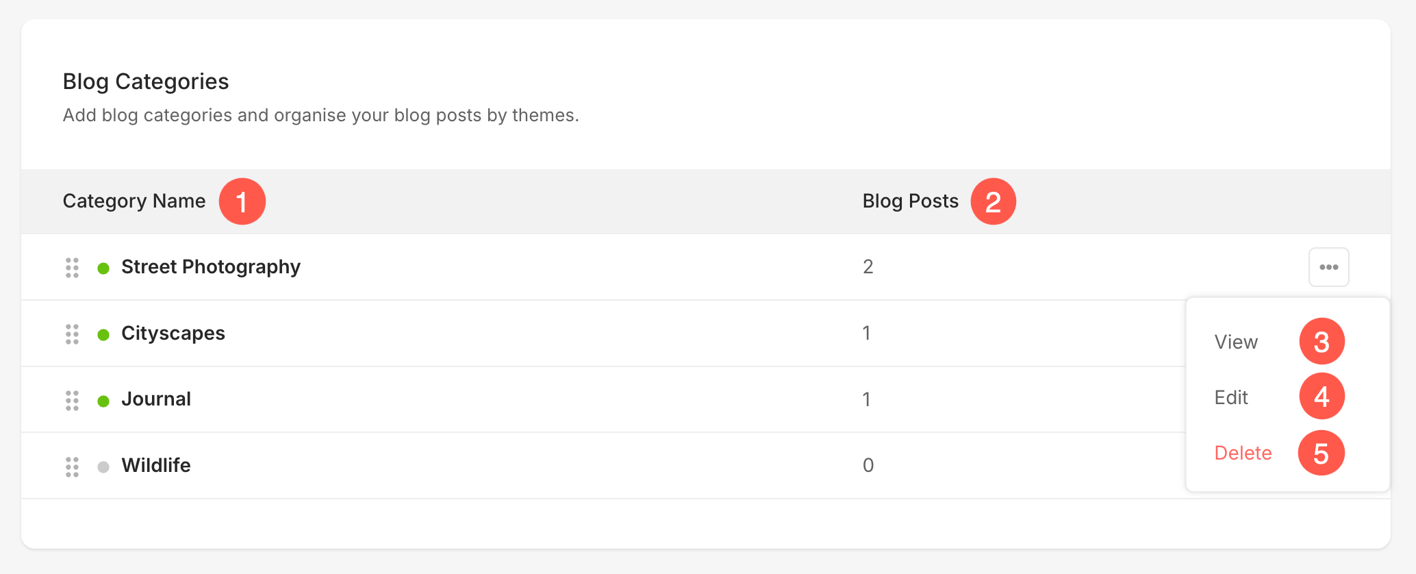 - Category Name – This column lists all the blog categories you’ve created. Each category is displayed along with a status indicator — a green dot means the category is active and visible on your blog, while a grey dot means it’s hidden. You can also drag and drop categories using the handle icon to resequence them, allowing you to control the order in which they appear across your blog or category listings.