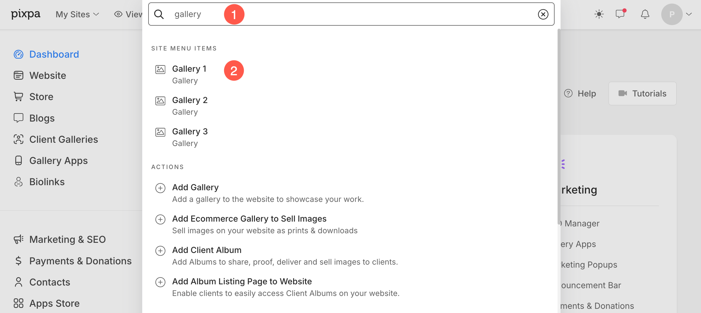 - From the results, find the gallery (under Site Menu Items) that you want to work on and click on it (2).