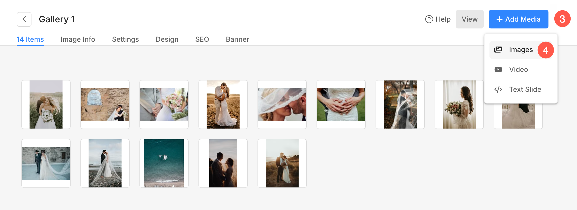- Under the gallery, click on + Add Media (3) button and select Images (4) option.