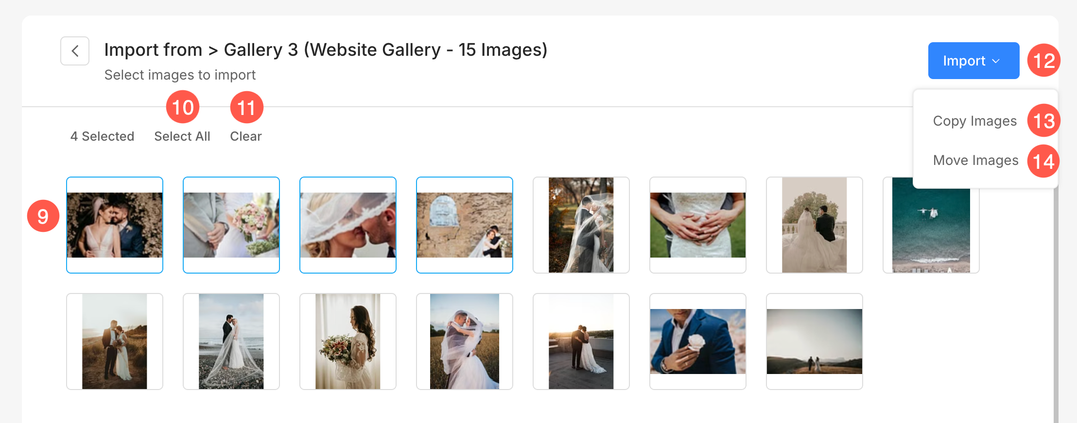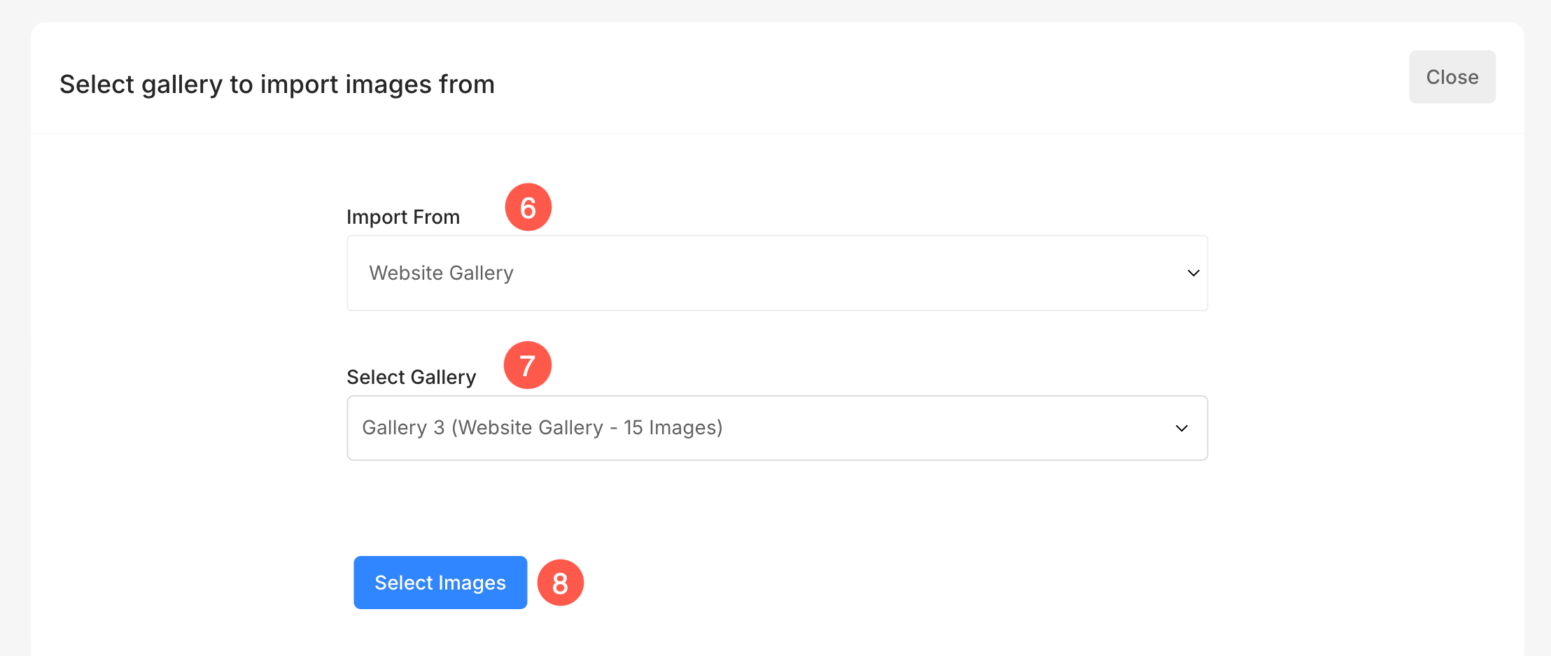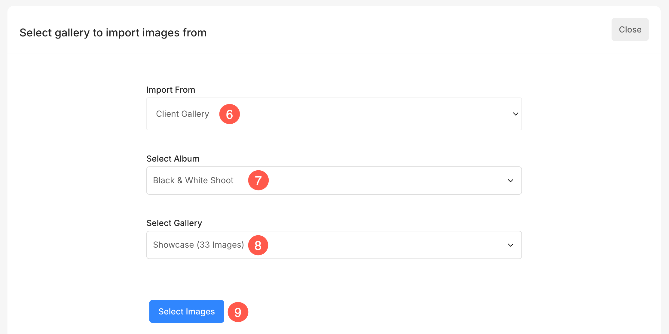 - Finally, select the Gallery (8) from where you want to import the images and click on Select Images (9) button.