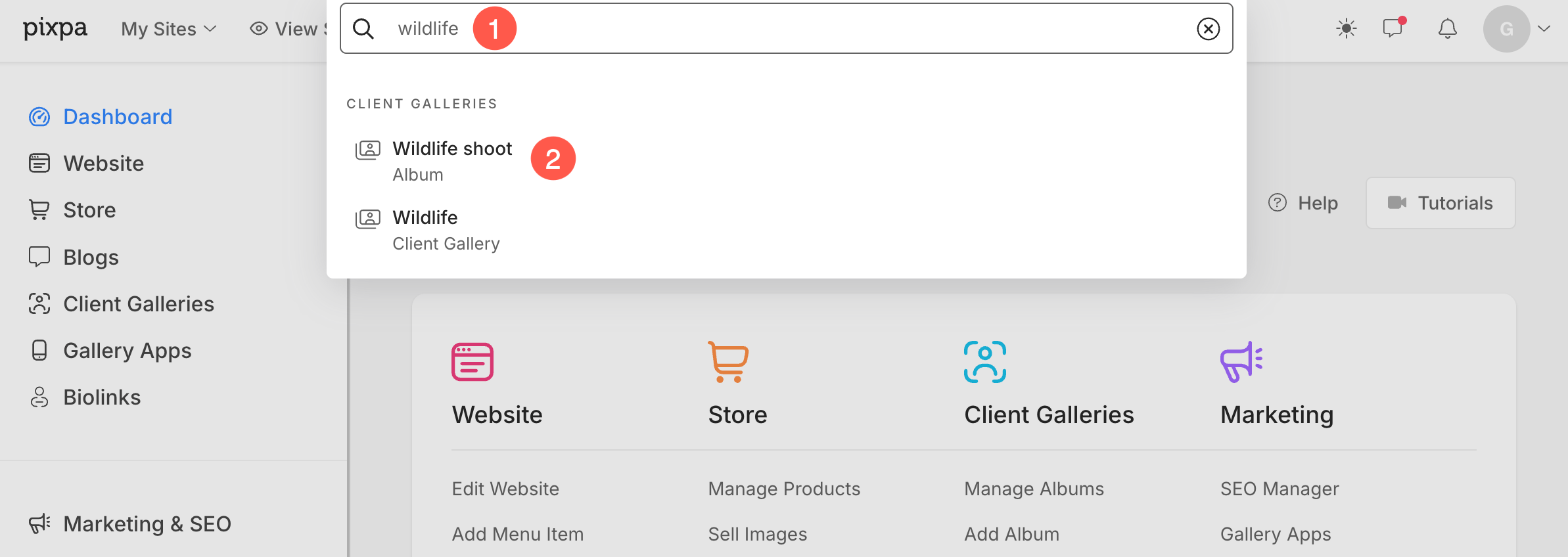 - From the results, find the gallery (under Client Galleries Items) that you want to work on and click on it (2).