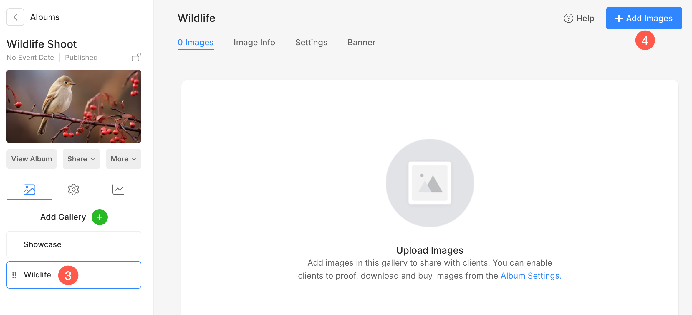 - Under the album, select the gallery (3) wherein, you want to import the images and click on + Add Images (4) button.