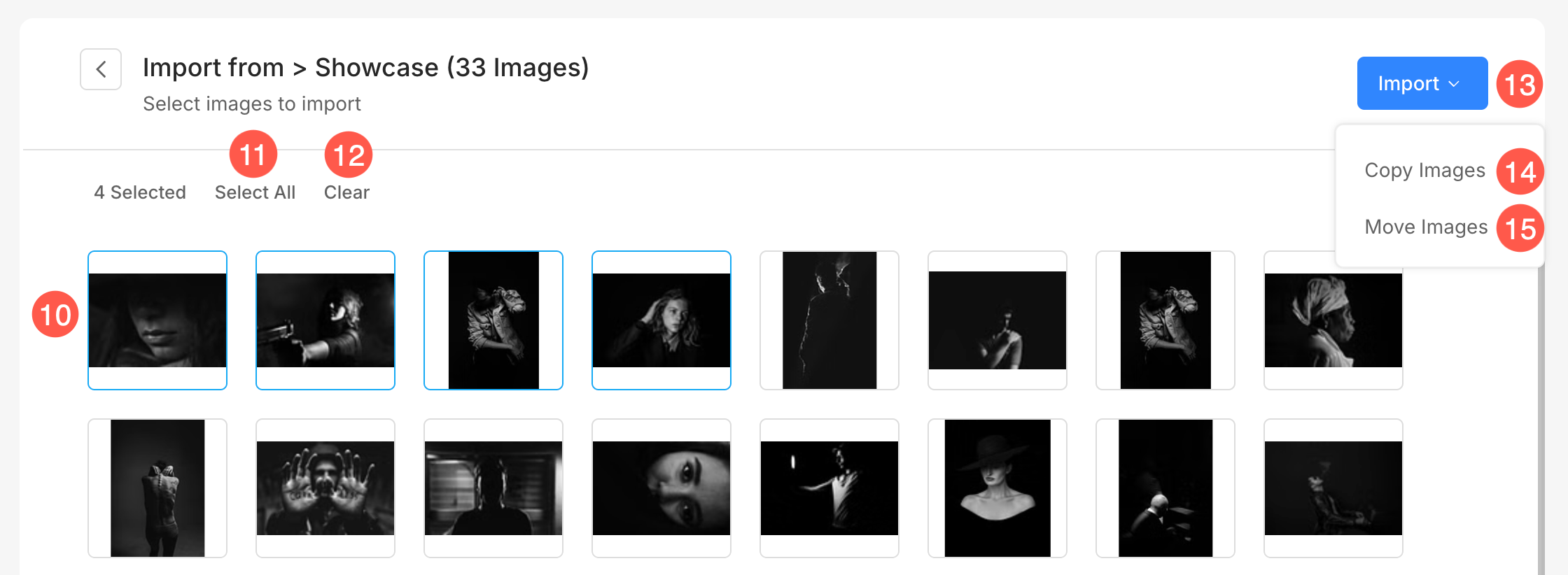 - From the dropdown, you can Copy (14) the images or Move (15) them.