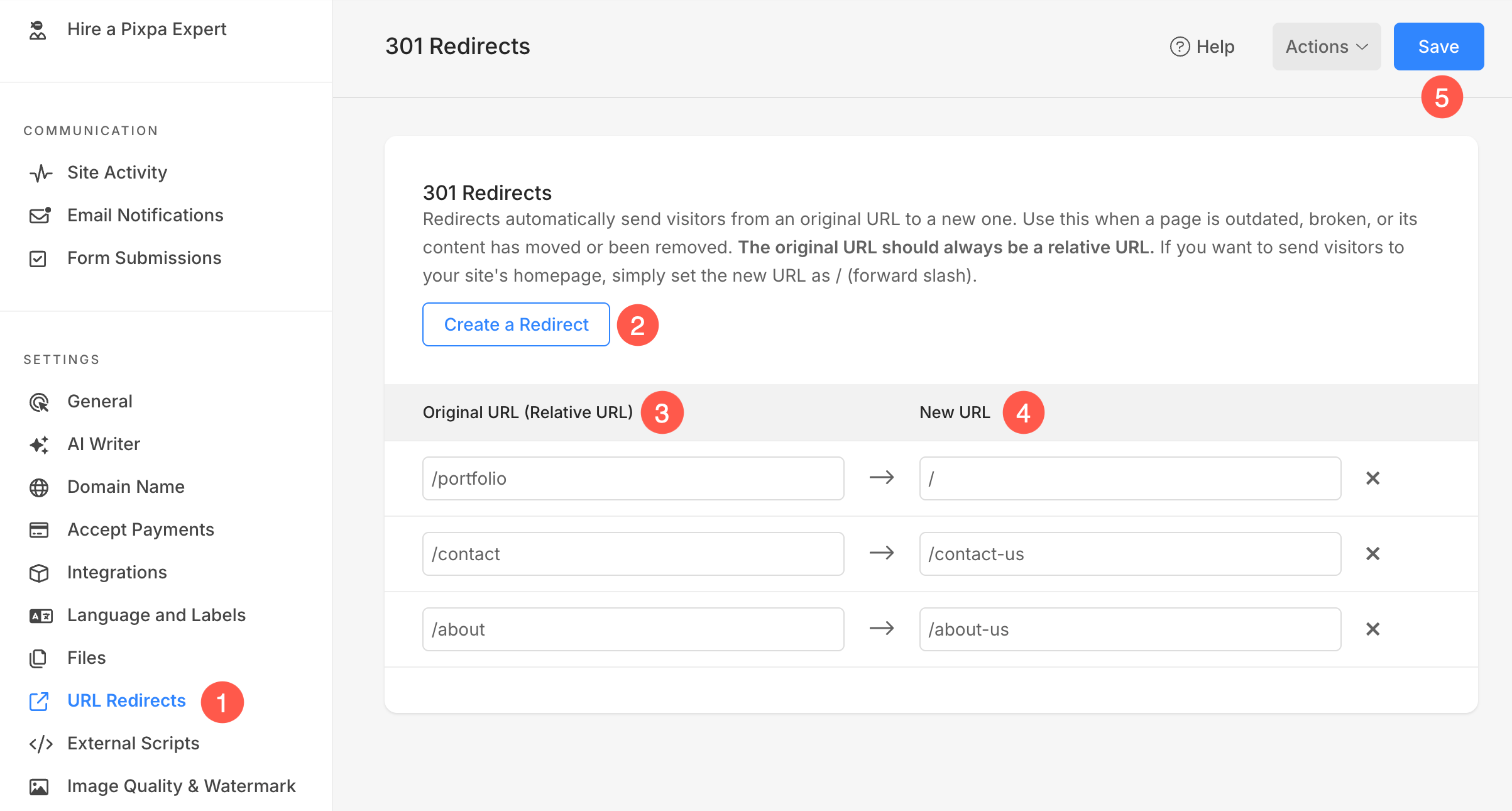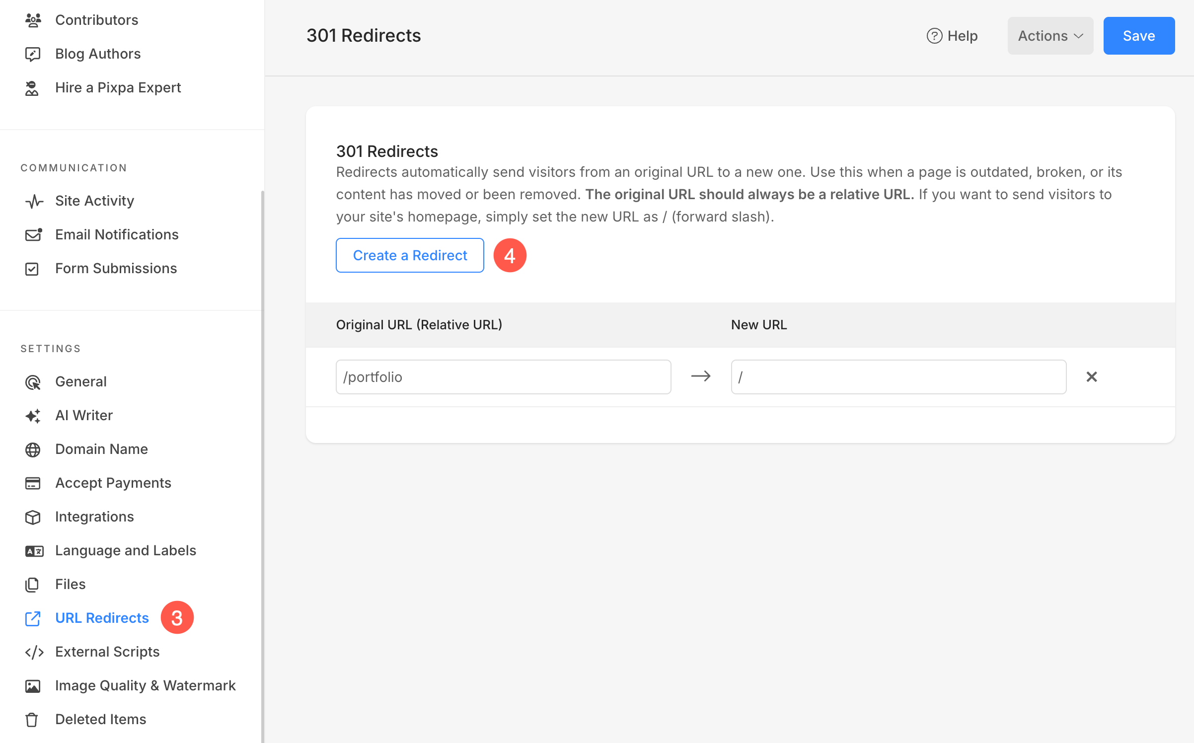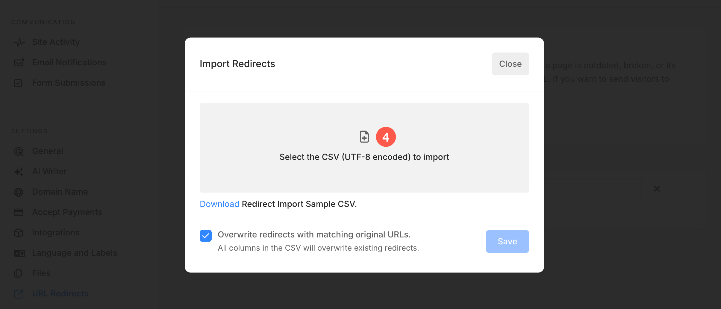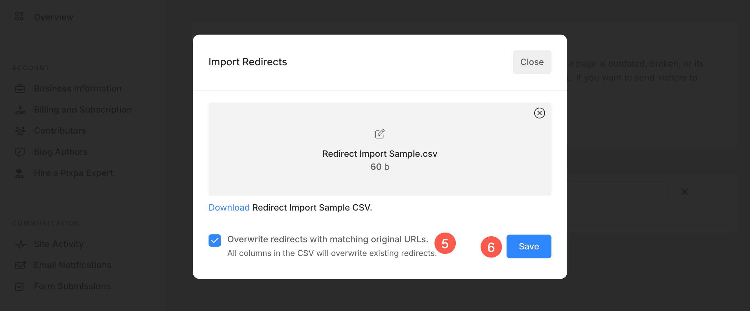- Upload the CSV file (4) to import the redirects to your Pixpa website.