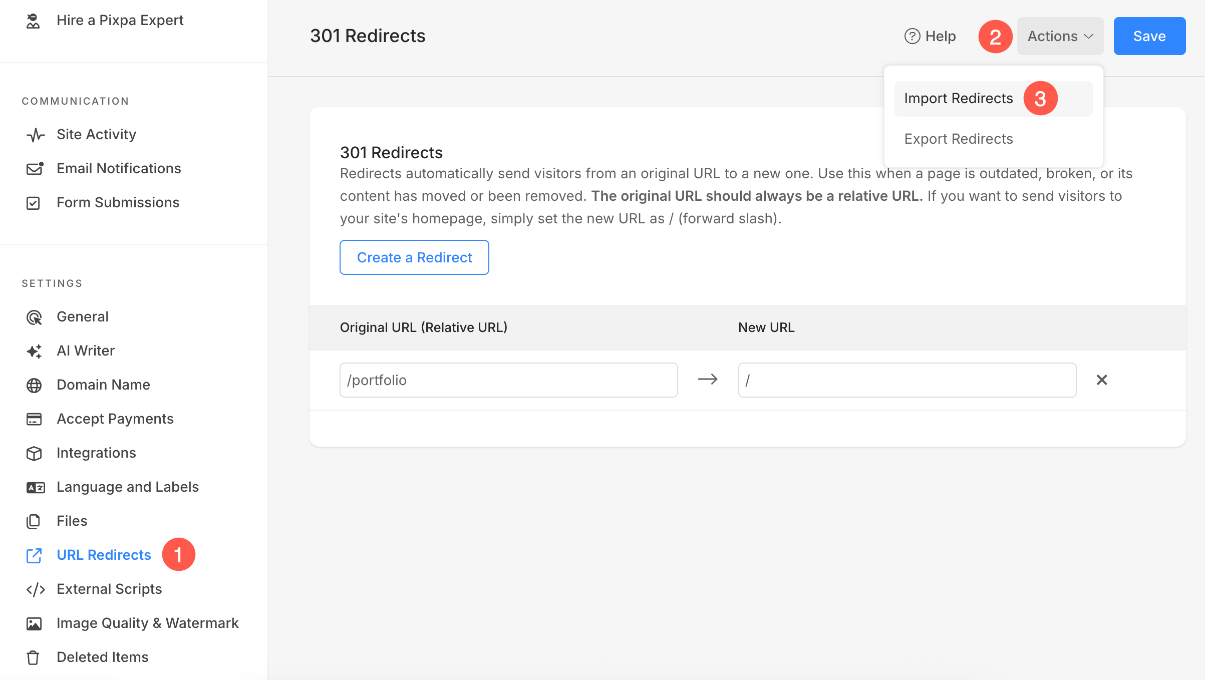 - Click on Actions (2) button and from the dropdown, select Import Redirects (3) option.