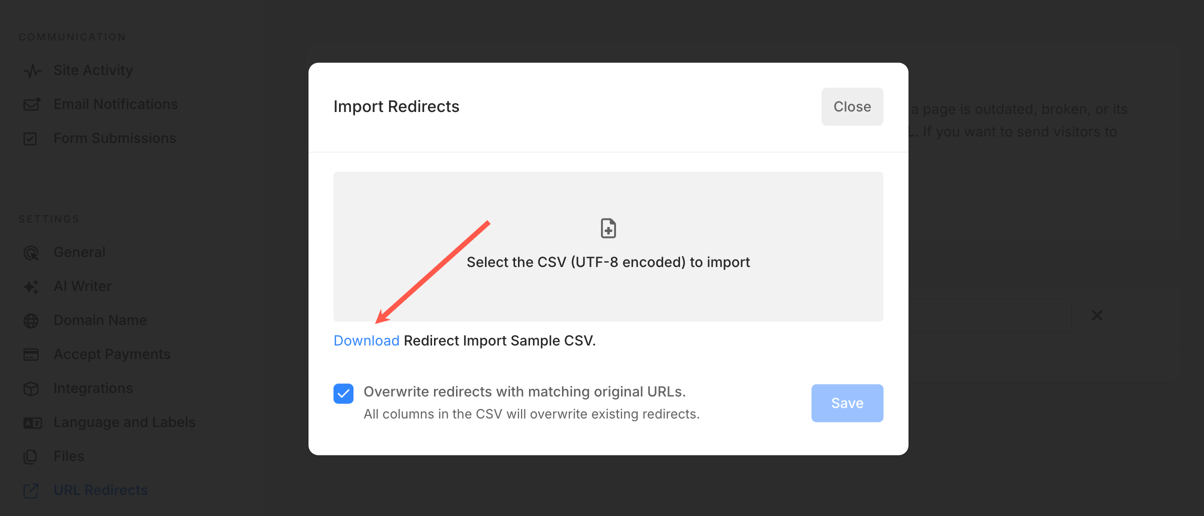 - Tick the checkbox (5) to overwrite redirects with matching Original URLs. This ensures that any redirect in the CSV file with the same source URL will be updated instead of getting duplicated.