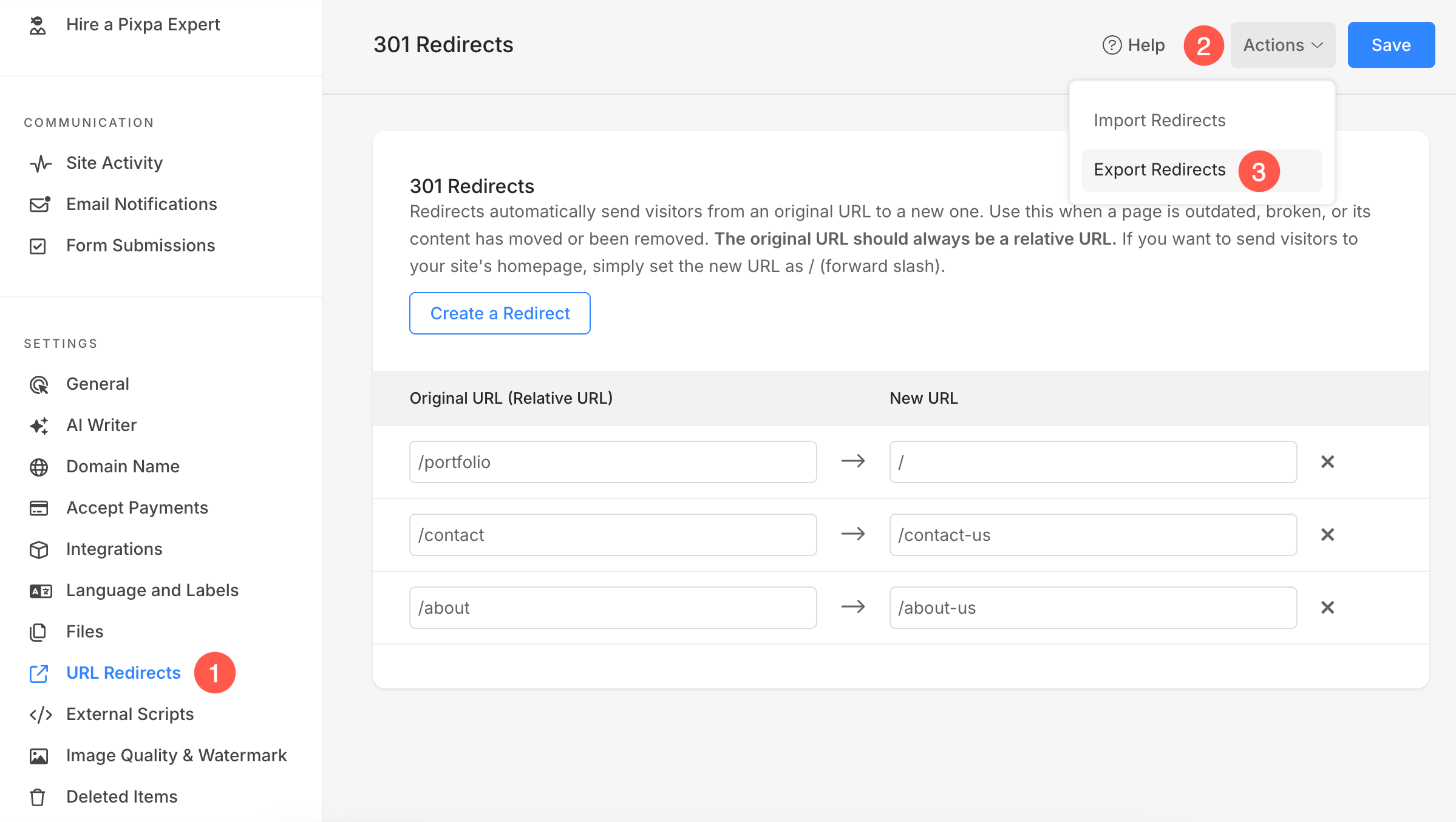 Exporting URL redirects from Pixpa allows you to download a structured file containing all your redirect rules. This makes it easy to review and manage your redirects, keep a backup, or import them into another Pixpa site or a different platform whenever needed.