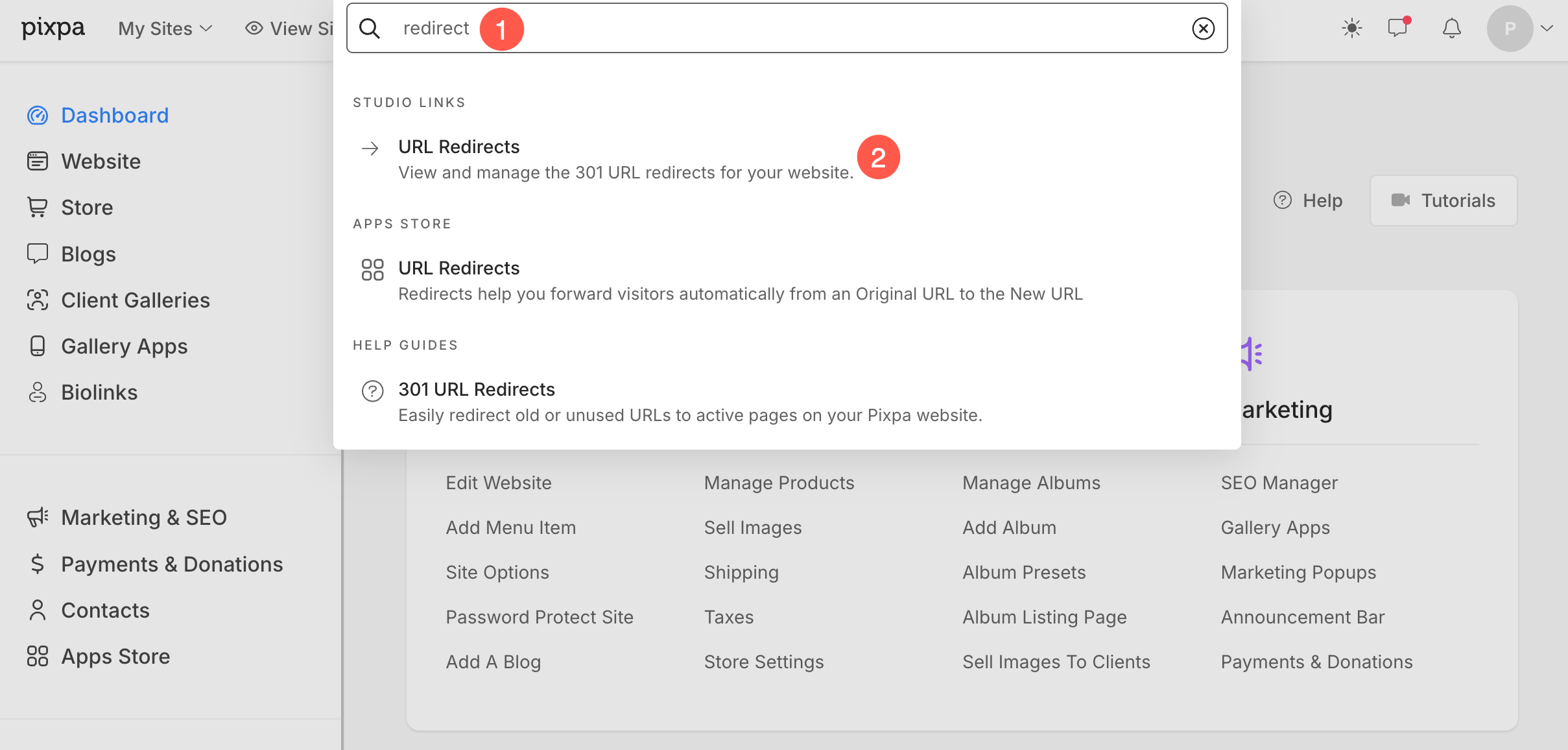 Alternatively, you can use Pixpa’s search option to navigate to the URL redirects section.