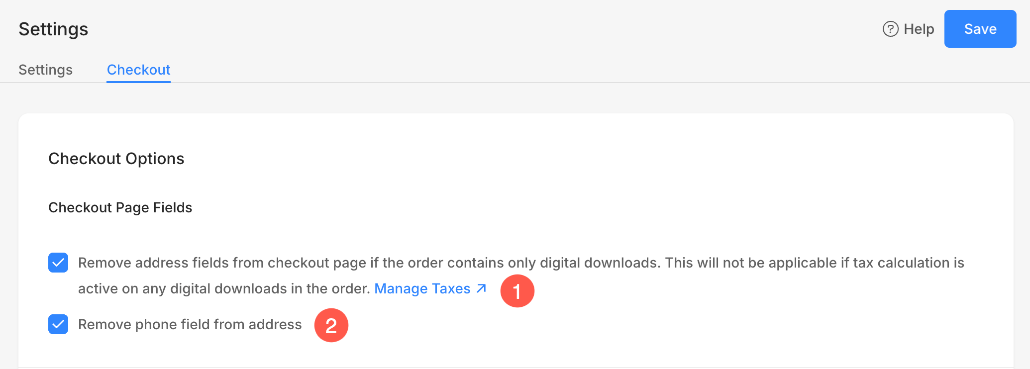 - Remove address field from checkout page – Check this option to remove the address fields during checkout if the order contains digital downloads or services. This option will be overridden if the tax calculation is active on any digital downloads present in the order.