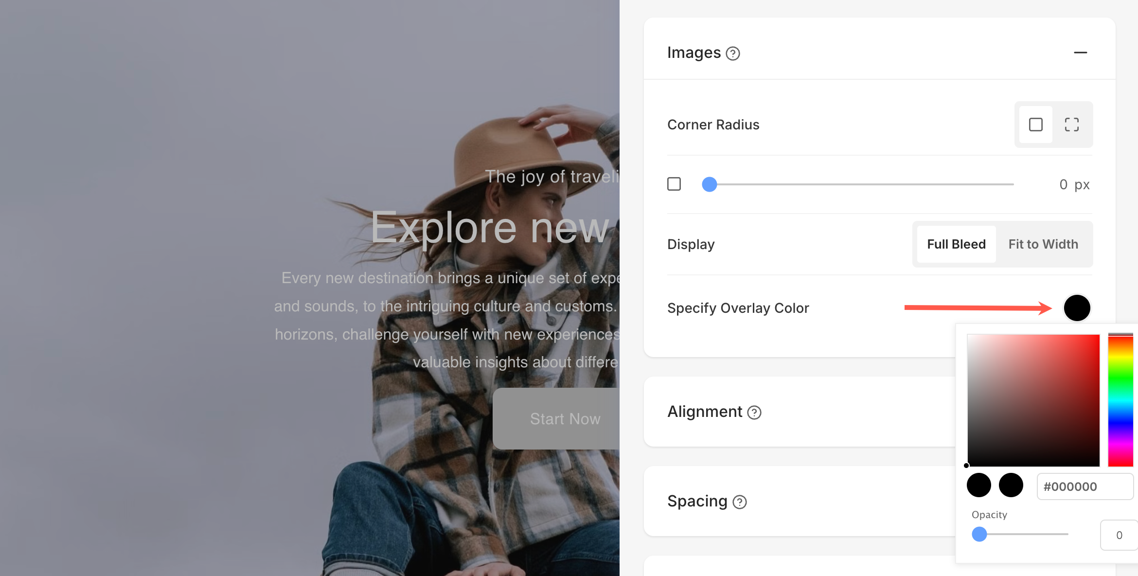 - Specify Overlay Color: This lets you apply a color overlay across the entire headline section. You can choose any color using the color picker and control its transparency using the opacity slider, helping you enhance text visibility or create a specific visual mood.