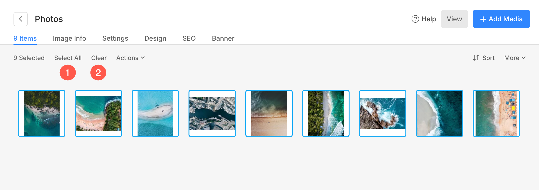 - You can select all the gallery items by clicking on the Select All button, and individual items by clicking on the item itself.