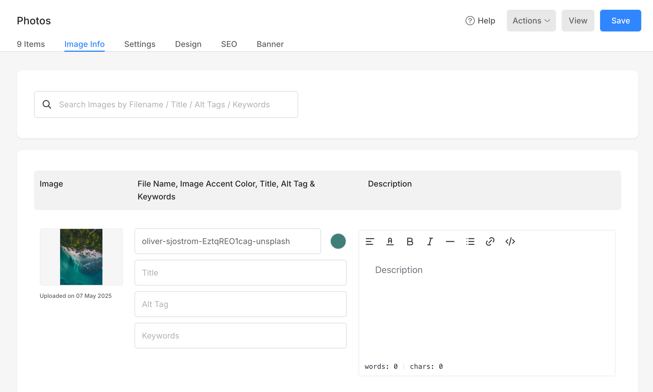 - Here you can edit the properties of an Image like Image Filename, Image Accent Color (used in some theme templates), Image Headline/Caption & Keywords, Image Description/Caption.
