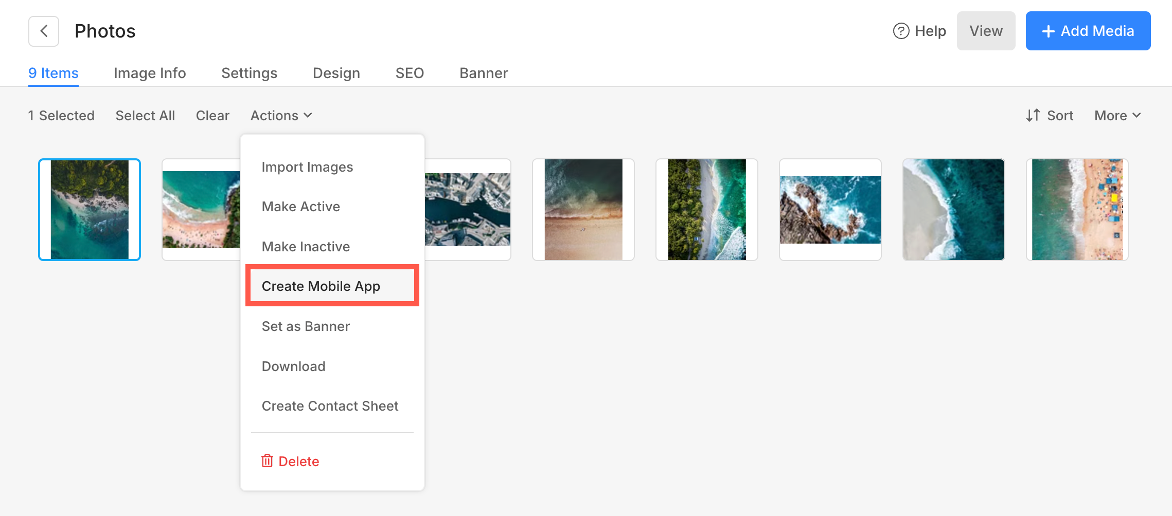 - After selecting the images, click on the Actions, then click on the Create Mobile App option.