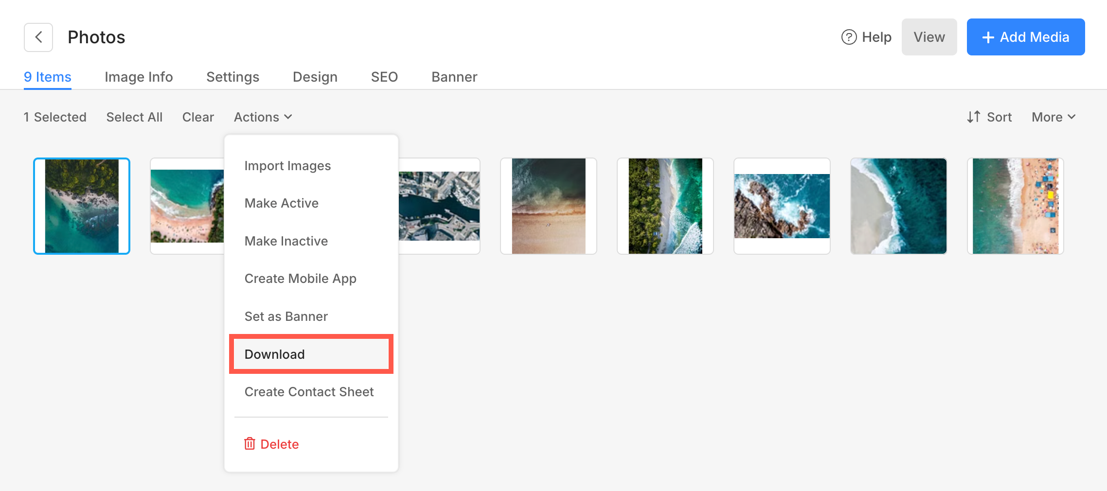 - You just need to select the Images, click on the Actions button, and then, click on the Download from the dropdown.