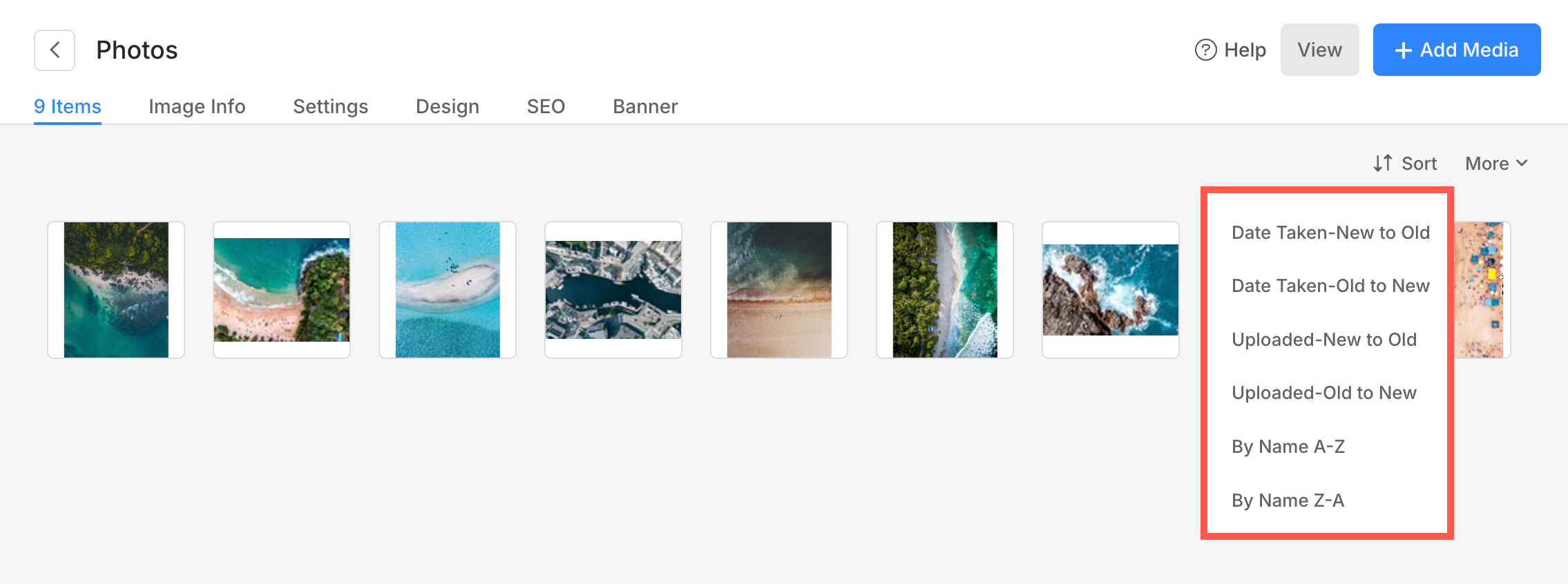- Simply click on the Sort button and select the condition to sequence your gallery items.