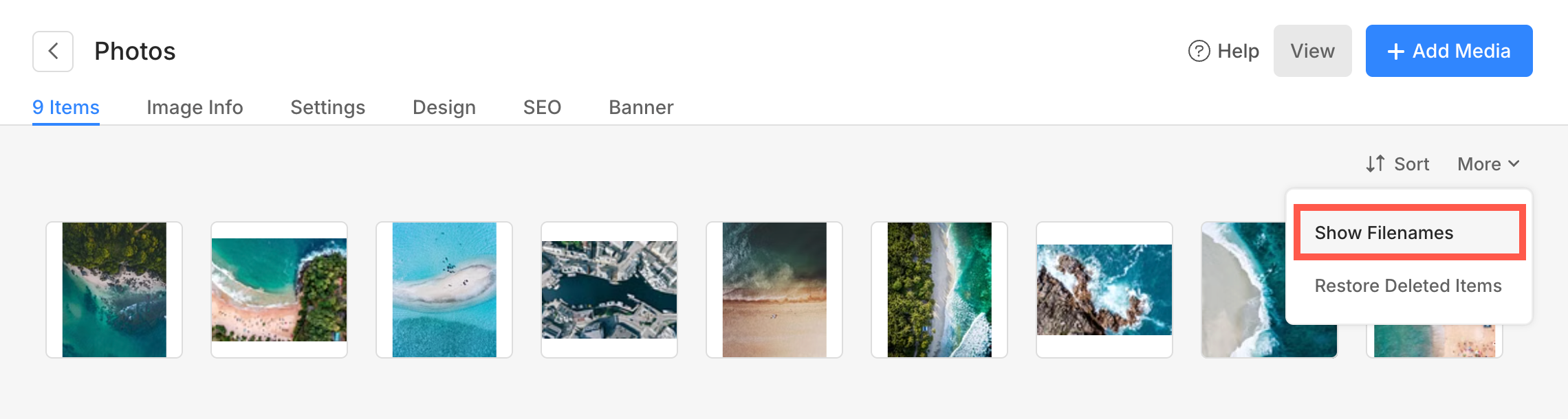 - You can easily see the filenames of all the uploaded Images. Under the More tab, click on the Show Filenames button to view them.