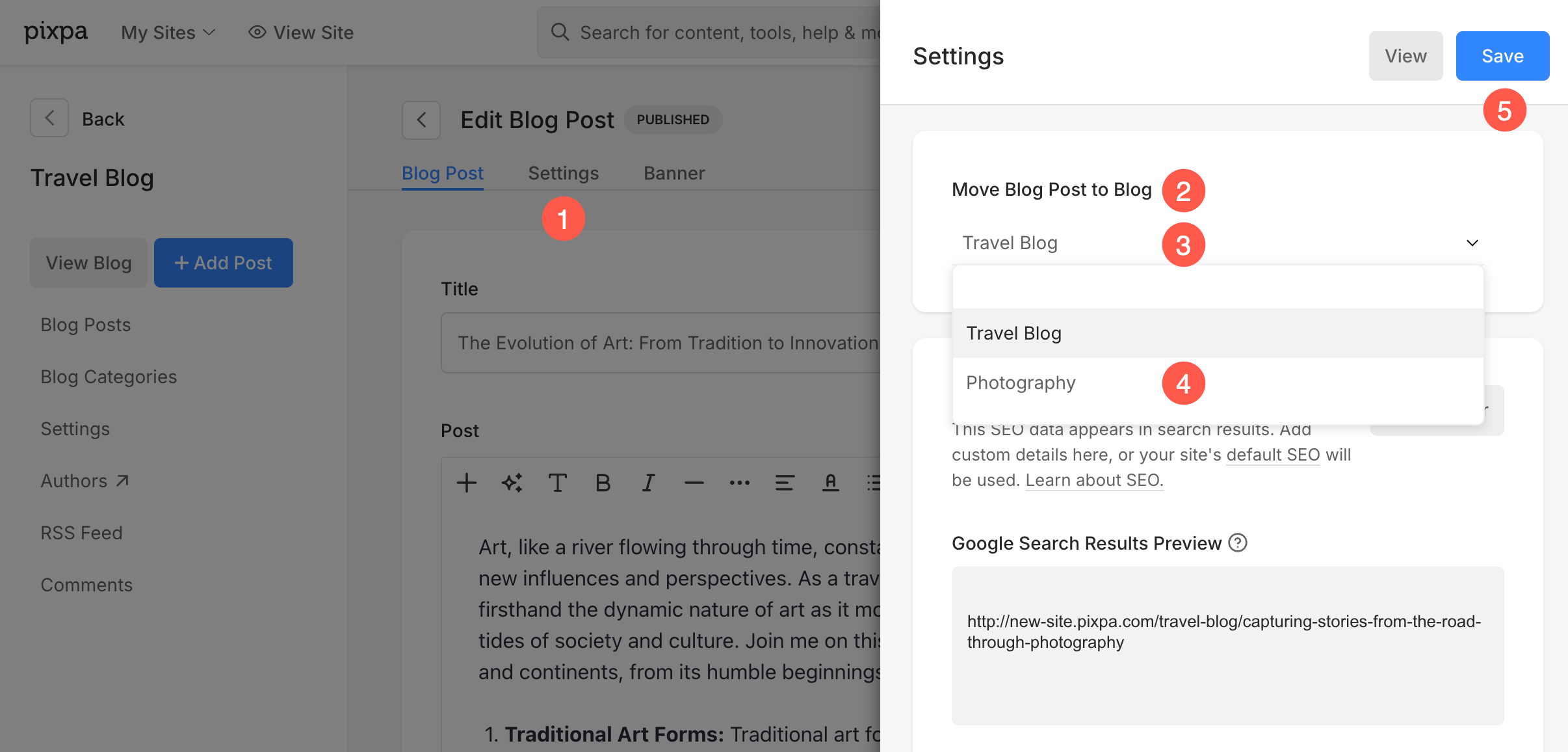 Pixpa allows you to create and manage multiple blogs within a single website. To help you organize your content better, you can move blog posts from one blog to another without recreating or copying the post manually. This is useful when restructuring your content, separating topics, or reorganizing blogs under your website.