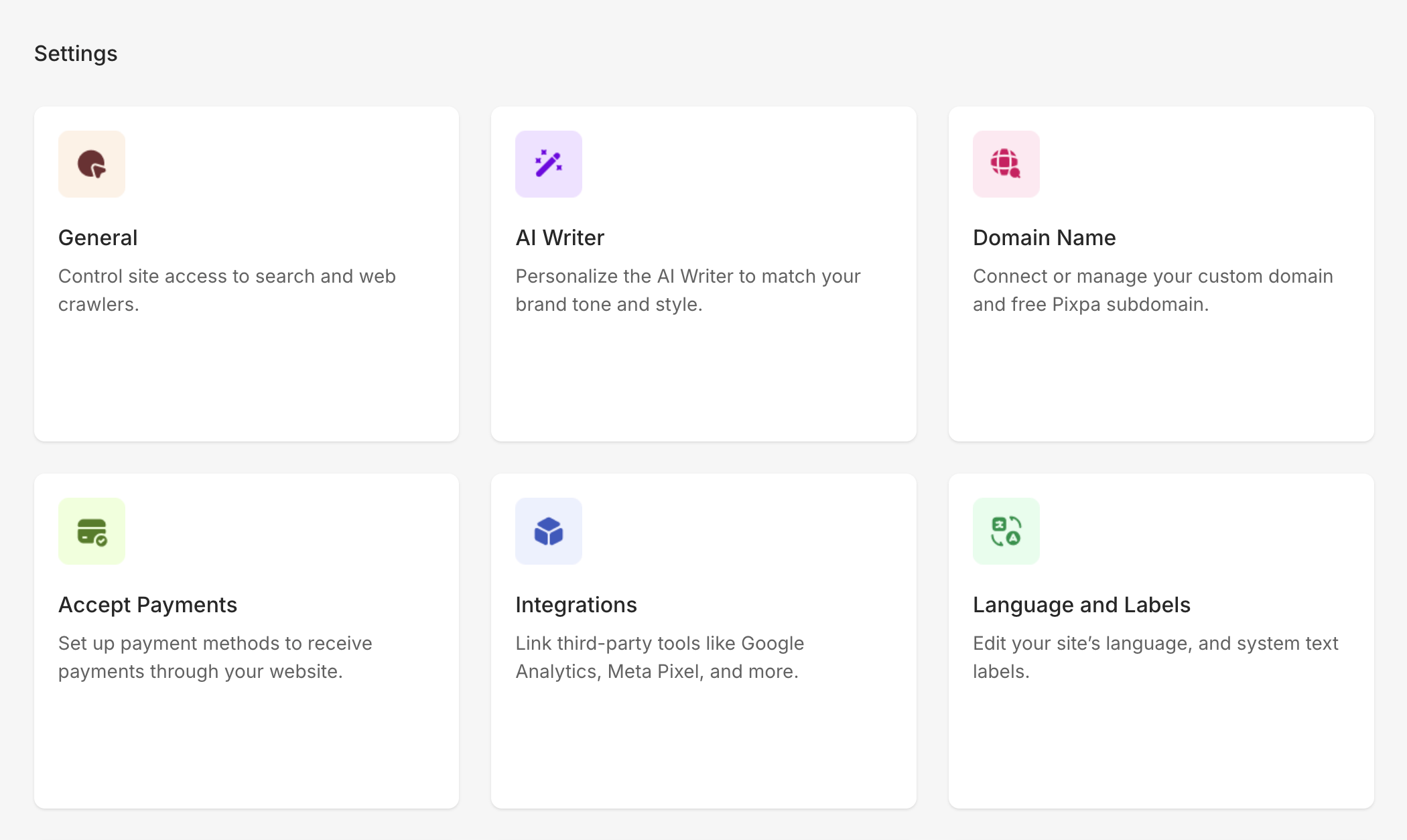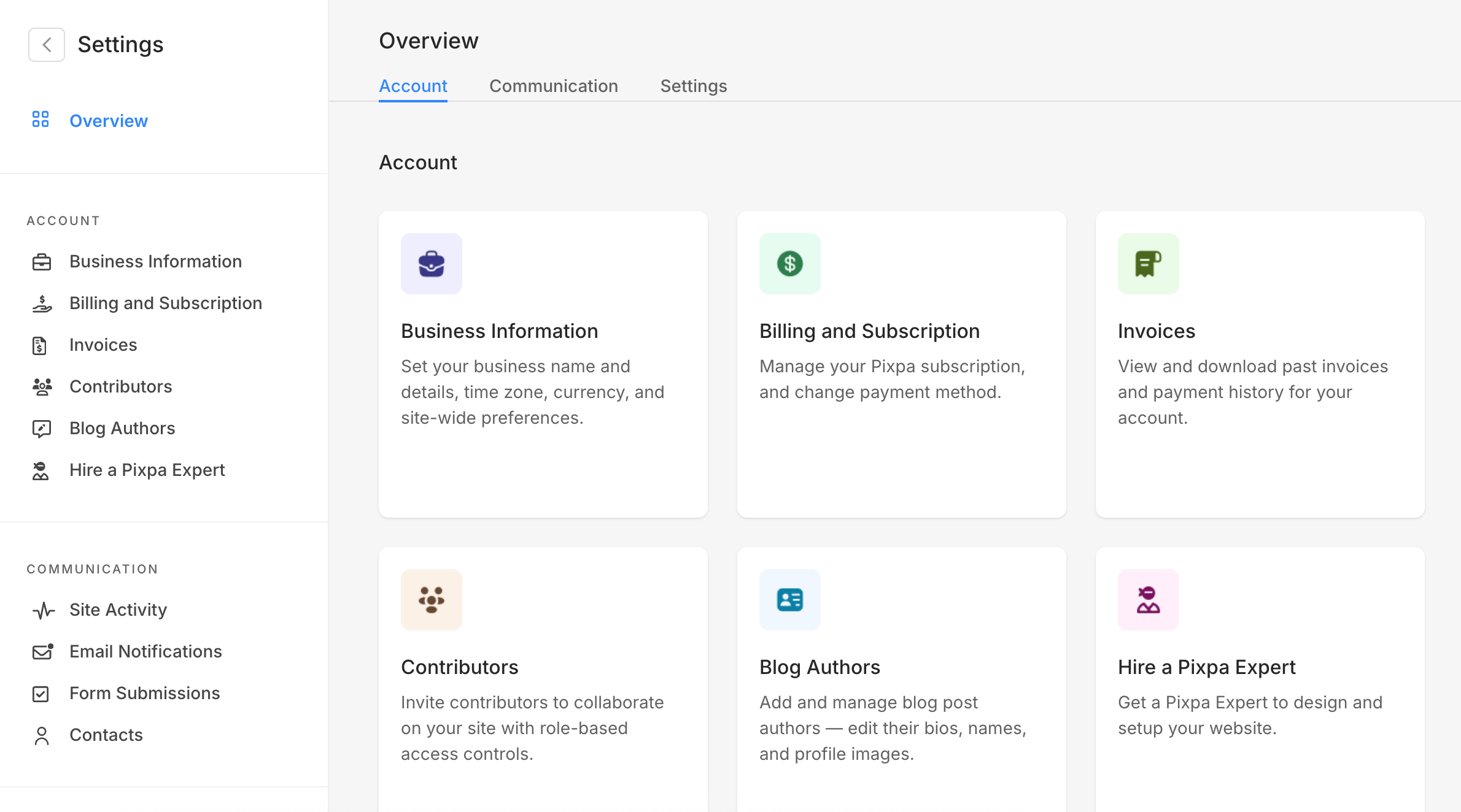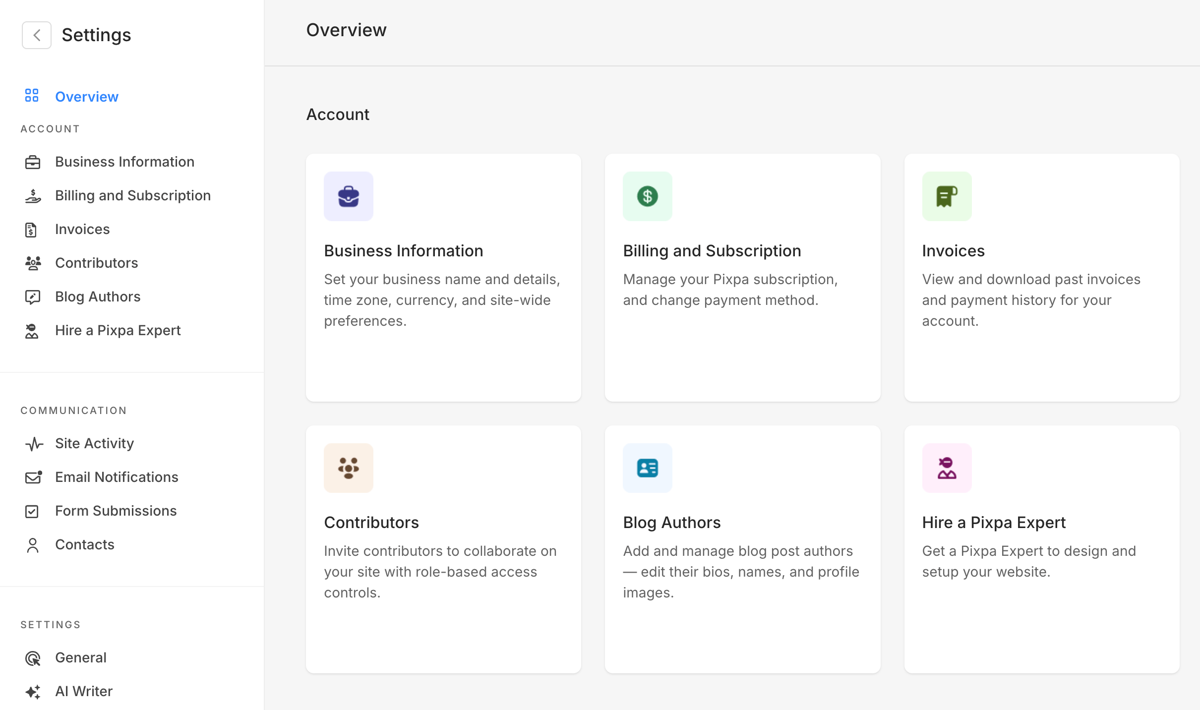 The Overview page provides a quick access point to all settings categories in one place, helping you easily navigate and manage your site configuration.