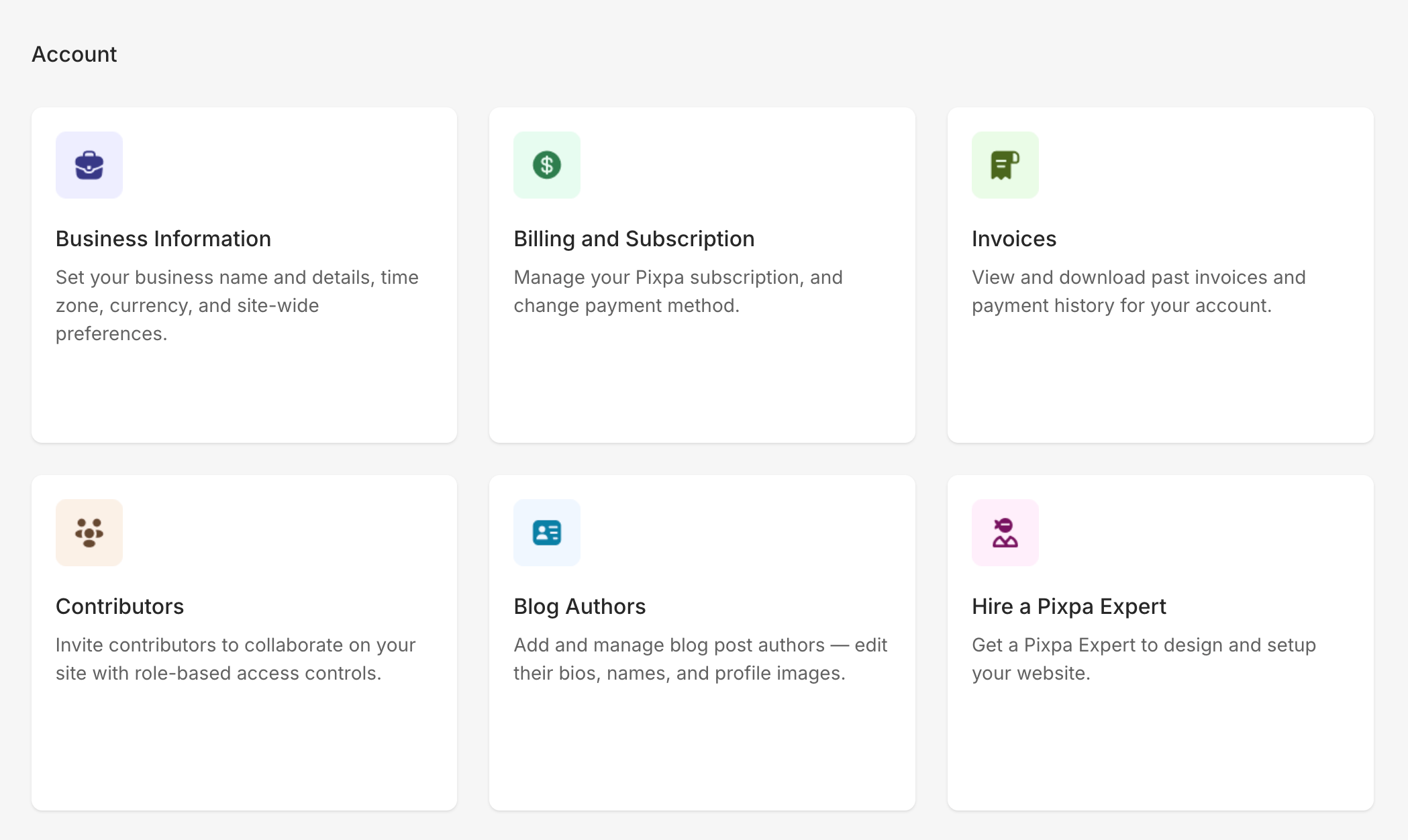 - Billing & Subscription – View your current Pixpa plan, manage your payment method, and handle renewals or plan changes with ease.