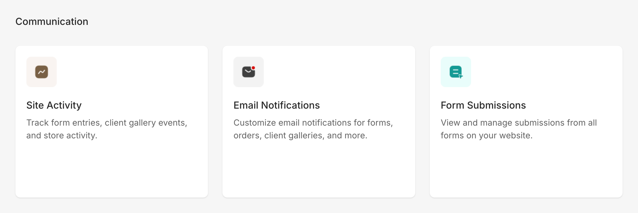 - Site Activity – Monitor your website’s overall activity, including store orders, form submissions, and client gallery actions, all from a single view.