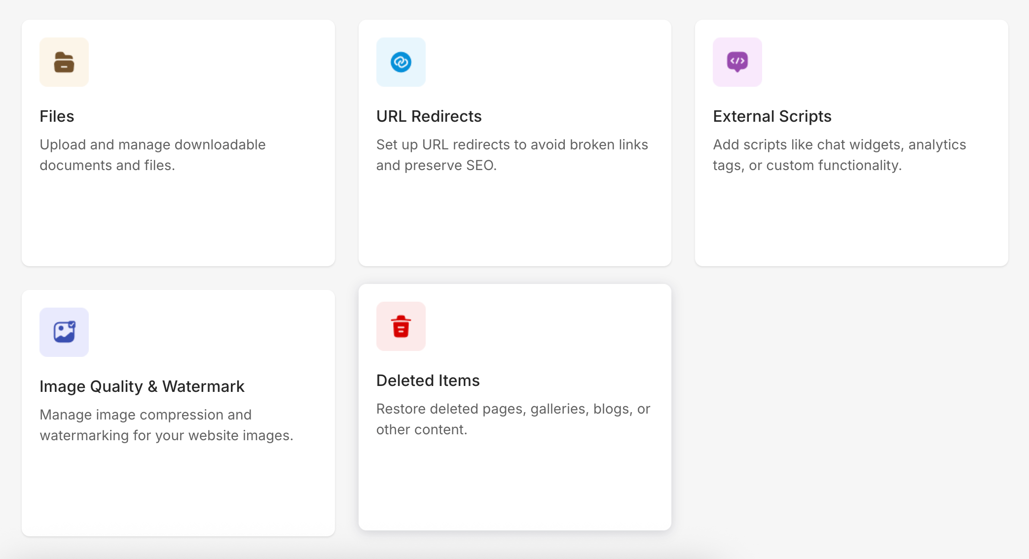 - Deleted Items – Review and restore items that have been deleted from your website, ensuring you can recover important content if needed.