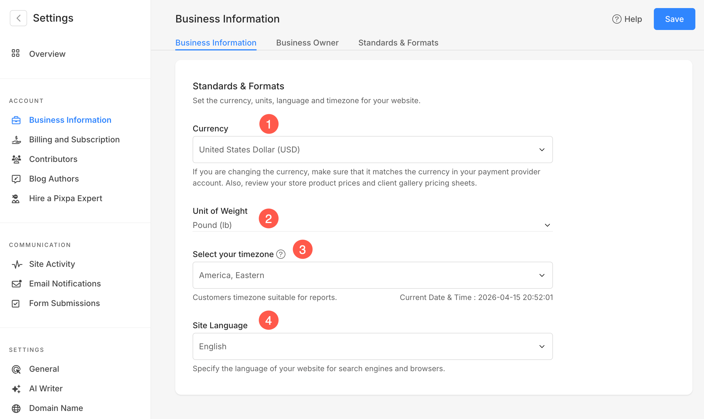 Du kan lokalisere nettstedet ditt ved å velge den lokalt foretrukne valuta, vektenhet, og tidssone for Pixpa-kontoen din fra Business Information side.