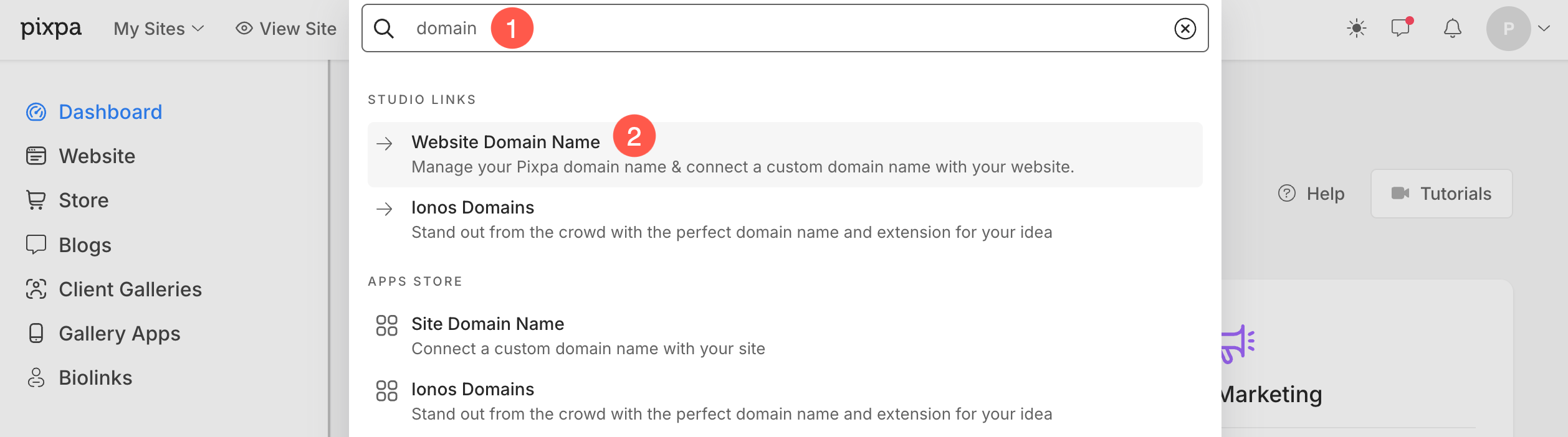 - Sök efter Domän (1) och klicka på Webbplatsens domännamn (2) alternativet.