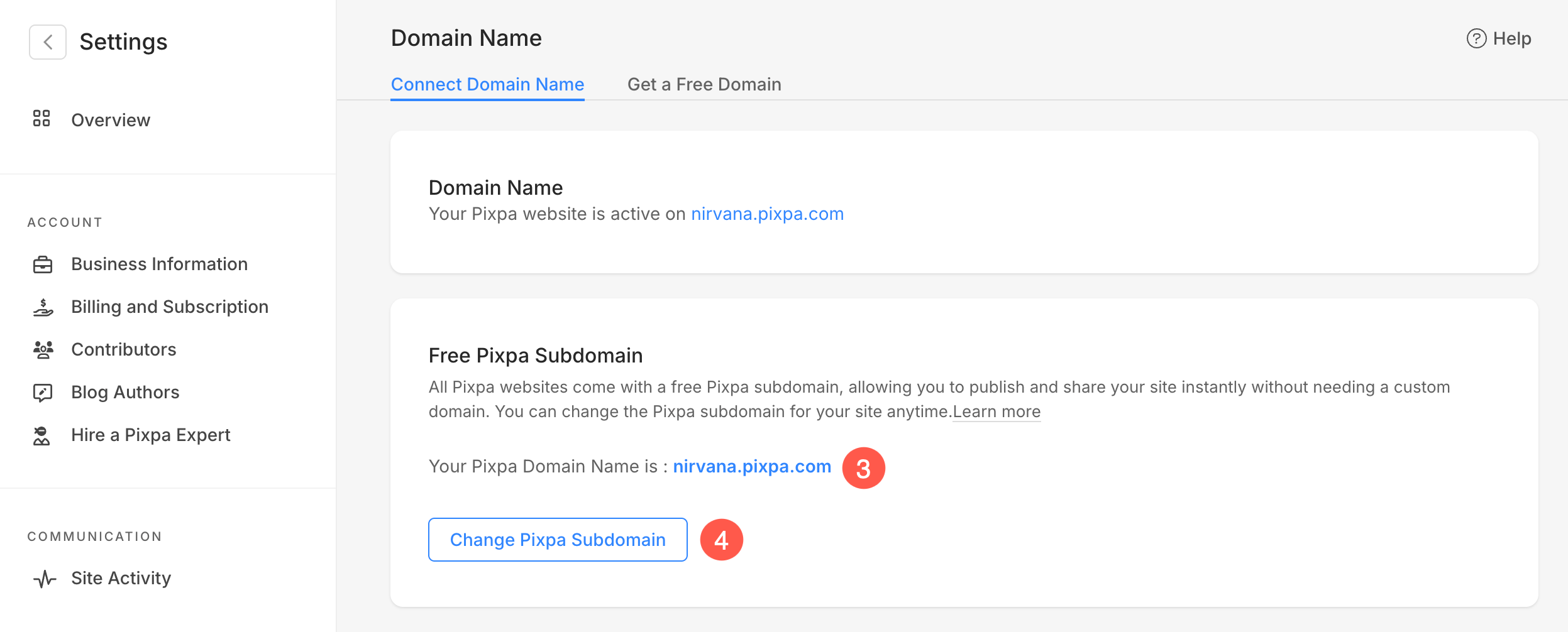 - Klicka på Ändra domännamn (4) button to change the Pixpa domain.