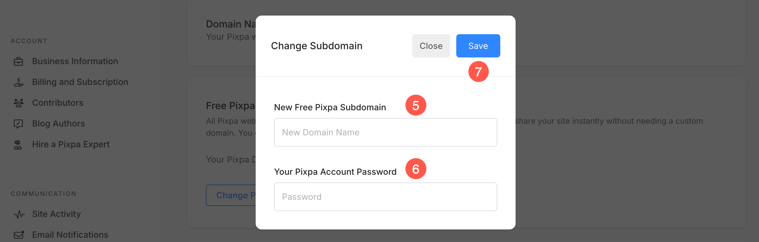 - Ange New Pixpa Domain name (5) that you want and the nuvarande lösenord (6) of your Pixpa account.